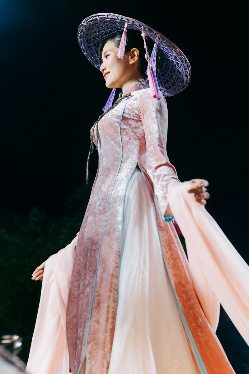 Nhà thiết kế Vũ Thảo Giang trình diễn bộ sưu tập "Sợi di sản" tại đêm khai mạc Lễ hội Áo dài TPHCM, tôn vinh 7 loại sợi tự nhiên Việt Nam, đặc biệt là tơ sen Quan Âm quý hiếm.