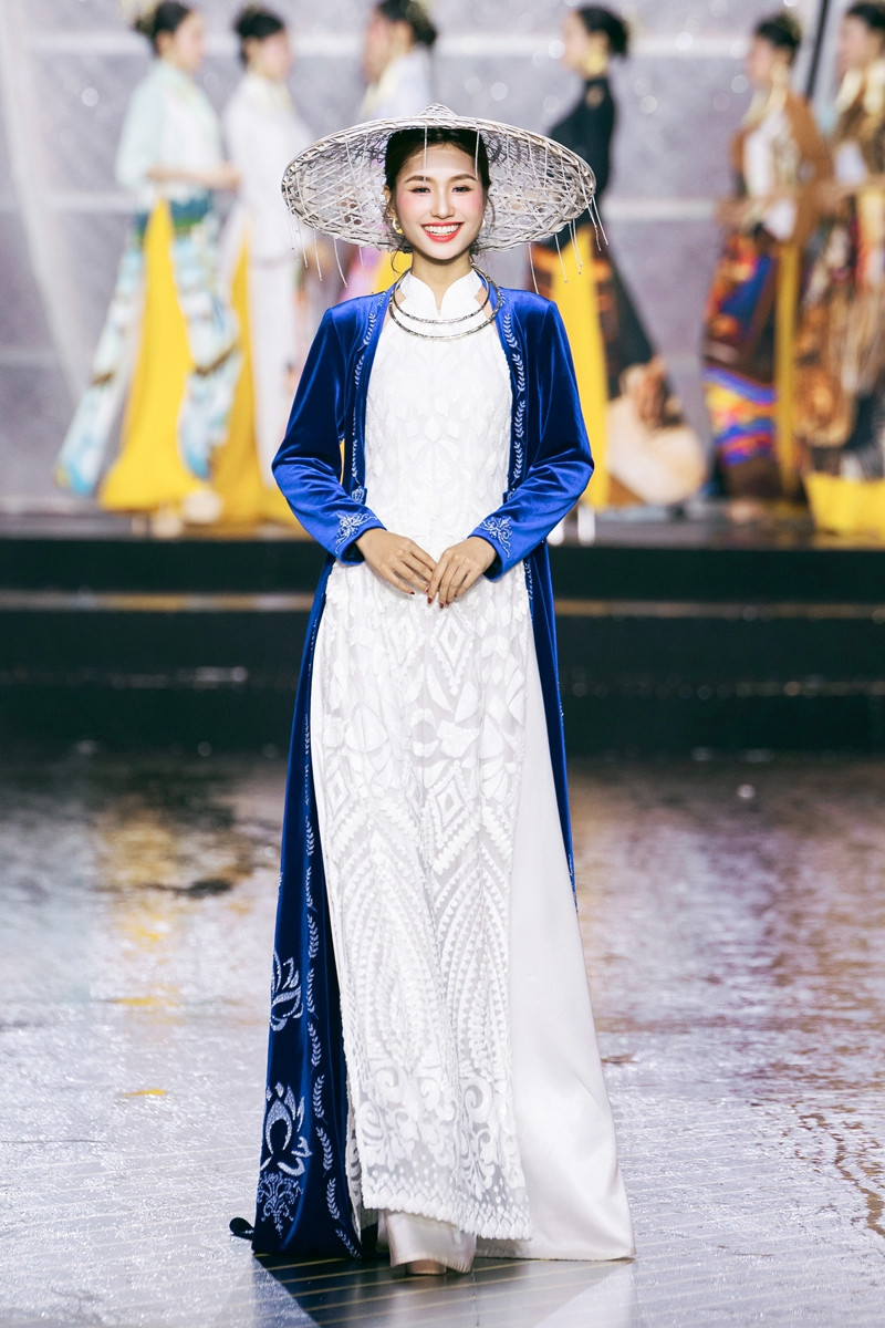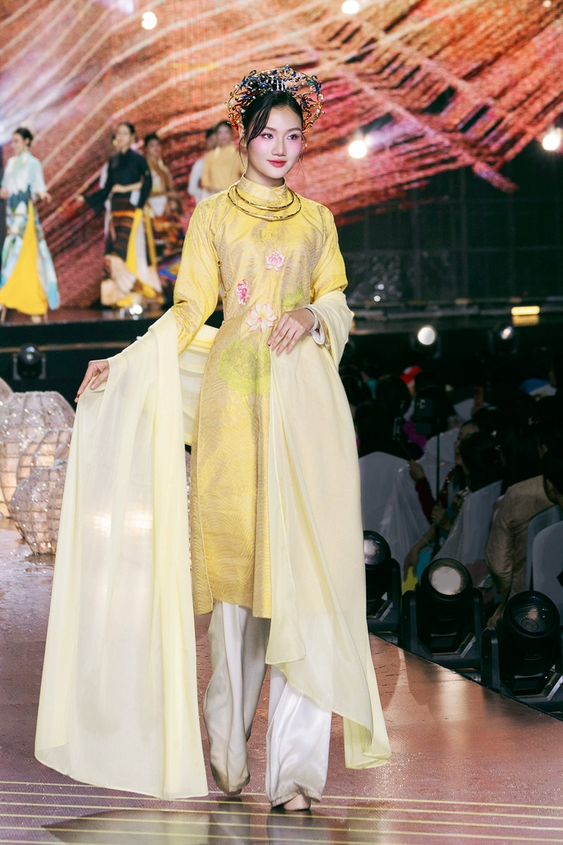 Á hậu Phương Thanh mặc áo dài thêu chỉ tơ sen Quan Âm trên nền vải dệt lối Sa Nam.